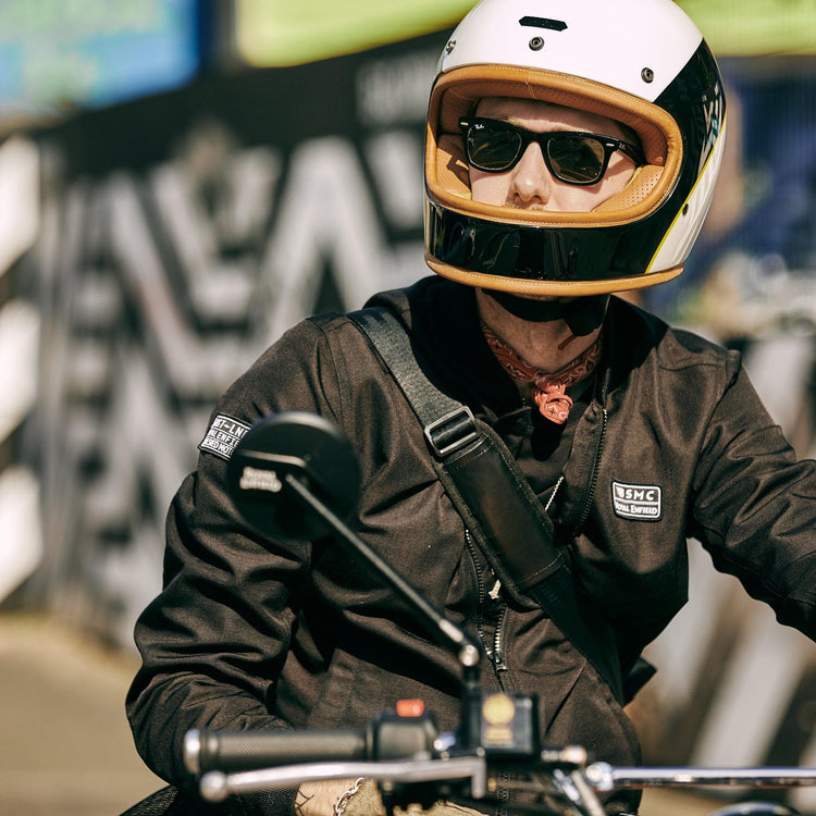 based on the silhouette of the classic 1950’s MA1 Bomber Jacket, originally designed for US Air Force Pilots and rapidly appropriated by riders of all styles for its timeless look and simple functionality. Celebrating the BSMC X Royal Enfield collaboration, the gold lining is printed with a split map, one side Shoreditch and the other the surrounding area of the Royal Enfield factory in Chennai.