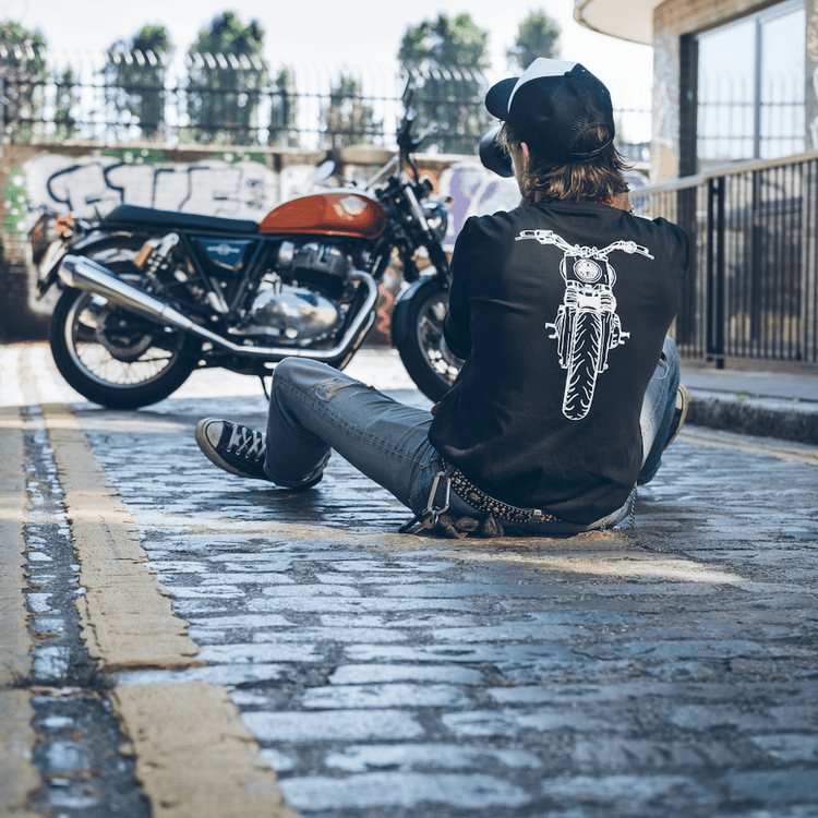 Our collaboration long sleeve Headlight Jersey bares a reduced iteration of our East London VIN plate graphic on the chest pocket and the frontal aspect of the BSMC x Royal Enfield Interceptor 650 on the back. Constructed from heavyweight 220gsm 100% Organic cotton our jersey is cut slim through the arm and long in the body, perfect to wear beneath your riding jacket.