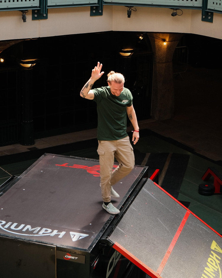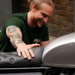 Model wearing our green BSMC Logo Shoreditch Motorcycle T-Shirt